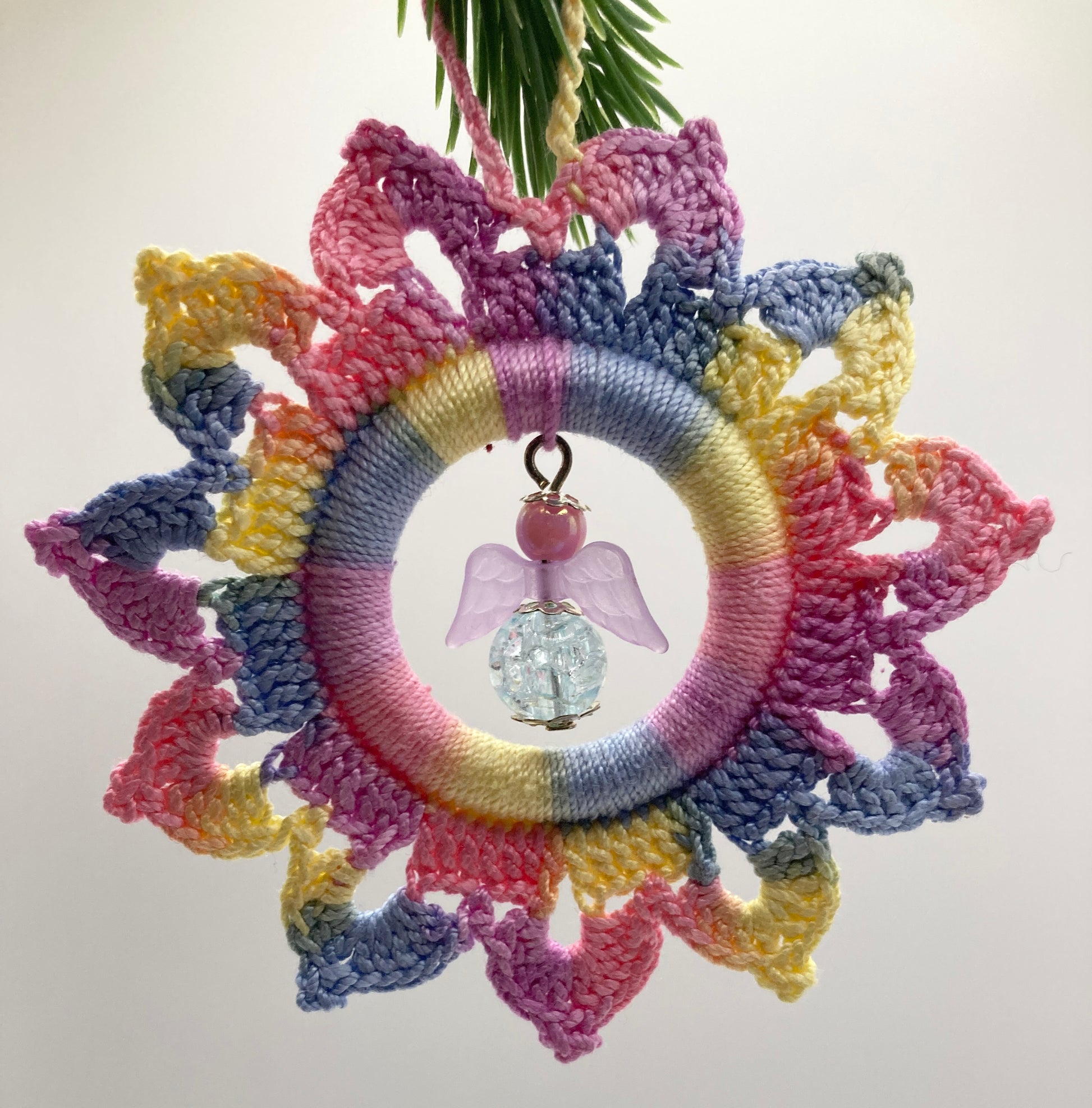 Dieser zauberhafte Regenbogen-Stern bringt fröhliche Farben in Ihr Zuhause! Das wunderschöne regenbogenfarbige Garn macht diesen Stern zu einem besonderen Blickfang - nicht nur zur Weihnachtszeit, sondern auch im Frühling. In der Mitte des liebevoll gehäkelten Sterns sitzt ein bezaubernder kleiner Perlen-Engel - eine harmonische Farbkombination, die diesem Unikat eine ganz besondere Note verleiht.